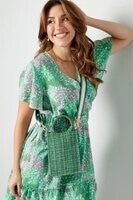 Hoe leuk is deze kleine langwerpige groene handtas! De tas is voorzien van een tof patroontje en heeft een bijpassende gestreepte bag strap. Helemaal trendy voor aankomend seizoen! De tas heeft voldoende plek voor jouw telefoon, portemonnee en nog meer spulletjes. Helemaal leuk om deze kleurrijke tas te combineren met meerdere bijpassende accessoires! Handtas met patroon & bag strap is gemaakt van 95% polyester en 5% metaal. Afmetingen: 16 x 27 x 8 cm.
