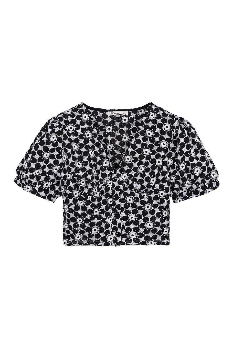 Zomerse crop top met bloemenprint, V-hals, korte mouwtjes en knoopjes aan de voorkant. De blousetop is gemaakt van polyester