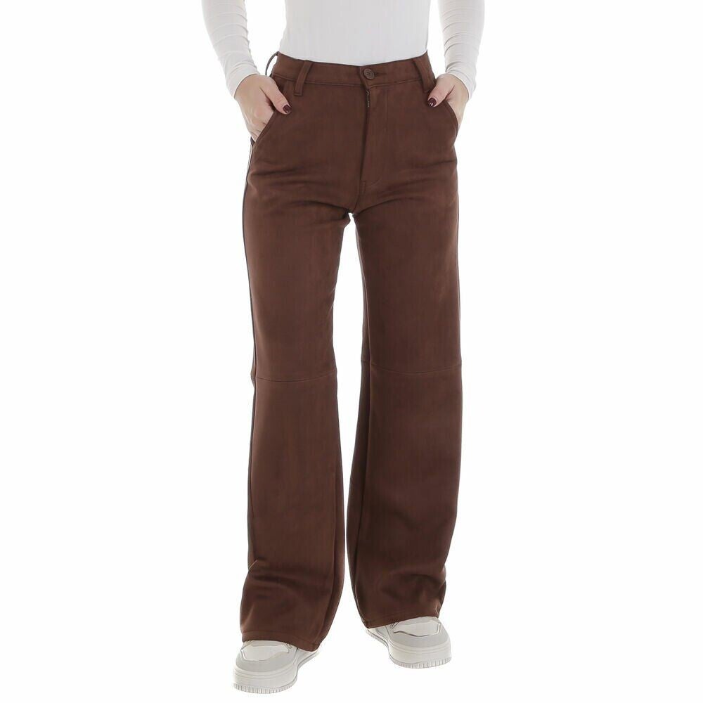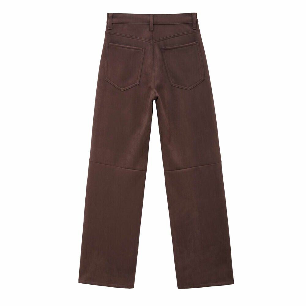 Deze broek is een jeans wide leg model in bruine suedine.