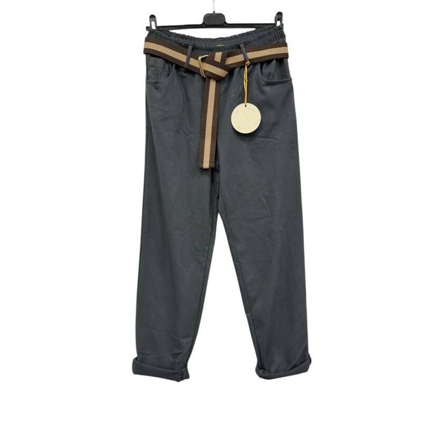 Deze broeken hebben een elastiche band en de riem is inbegrepen.
